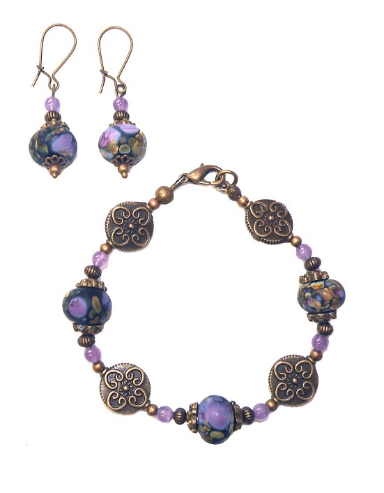 rows of Amethyst wheels lashed together with seed beads with Gunmetal